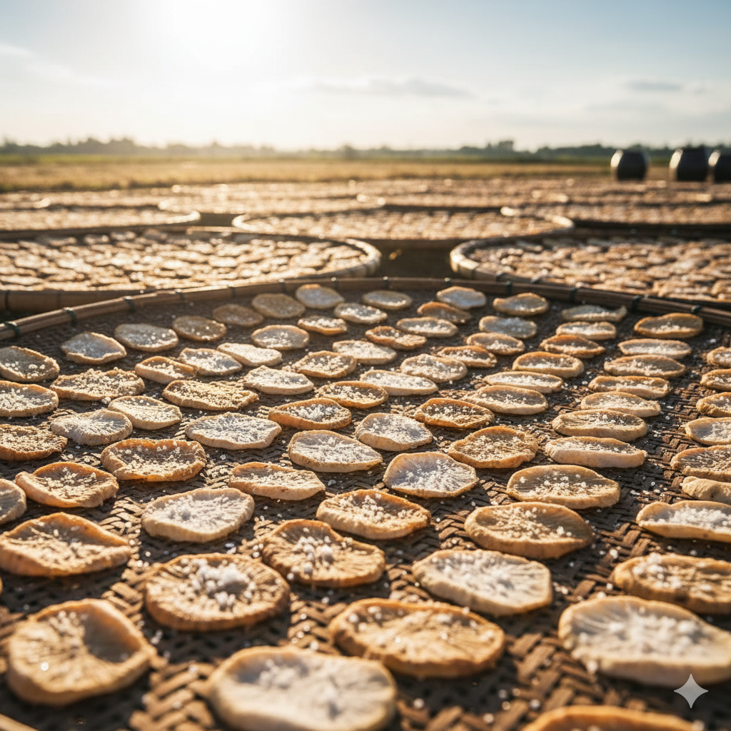 陽光下竹蓆上曝曬的蘿蔔乾特寫,呈現天然日曬工藝